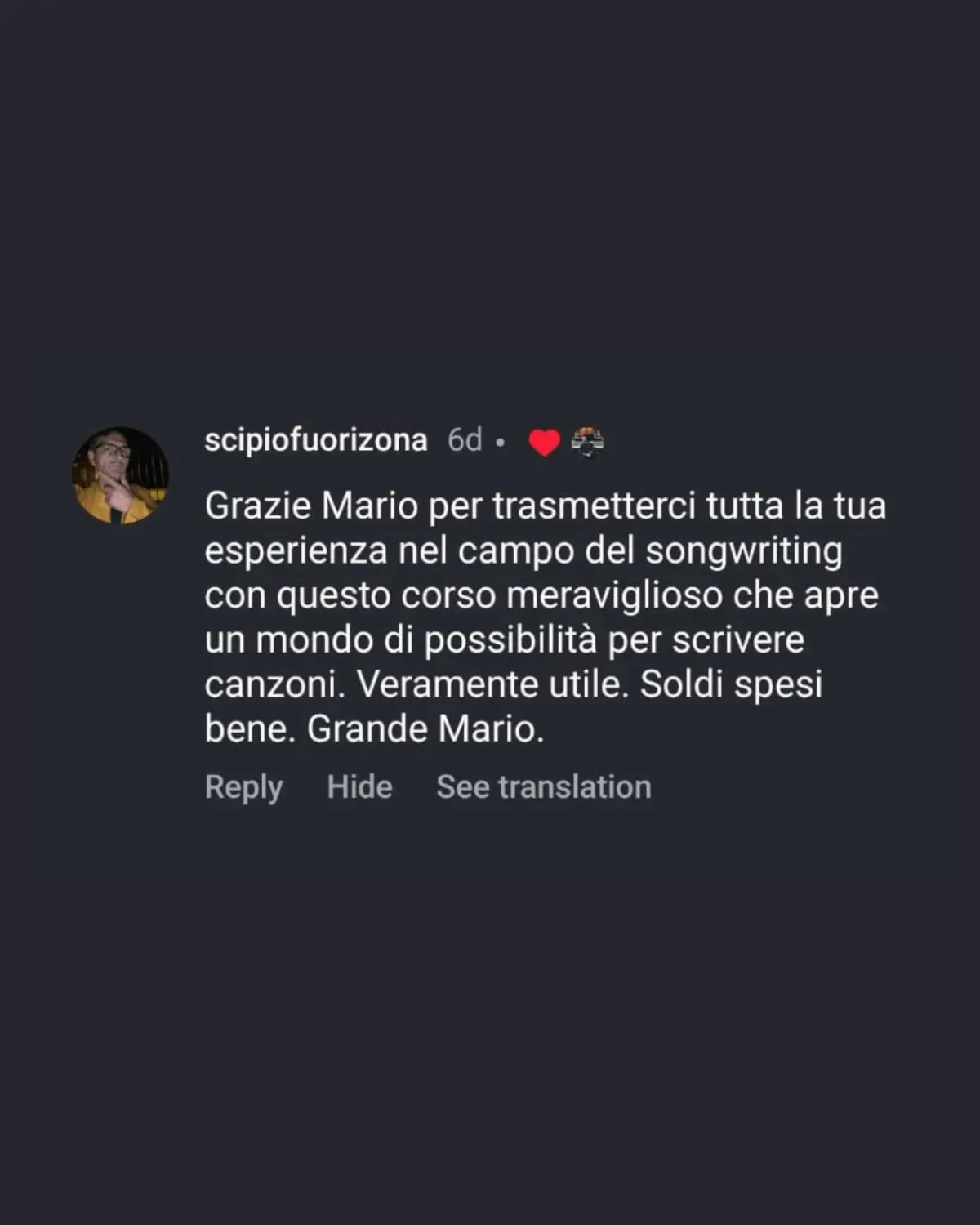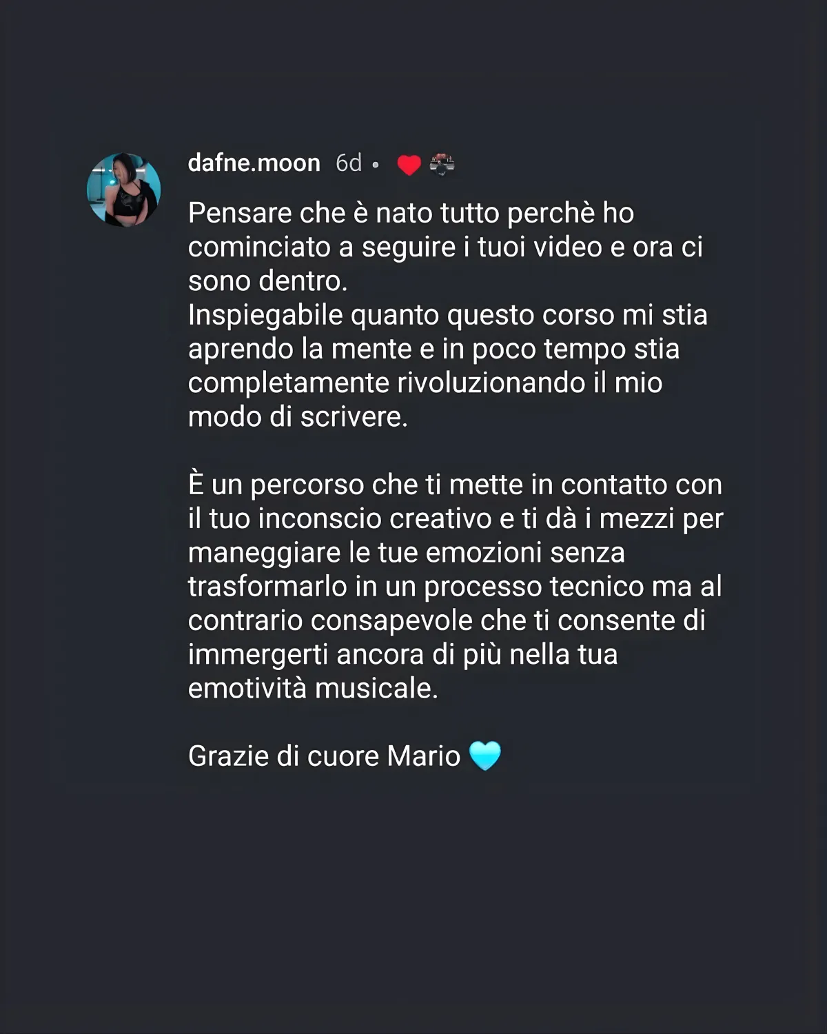 Autore e producer con esperienza tra Italia e Los Angeles, formazione Berklee College of Music. Ho lavorato con artisti italiani e internazionali, ho scritto colonne sonore per film e serie TV ed ho sviluppato un approccio pratico per tradurre emozioni in scelte musicali riconoscibili